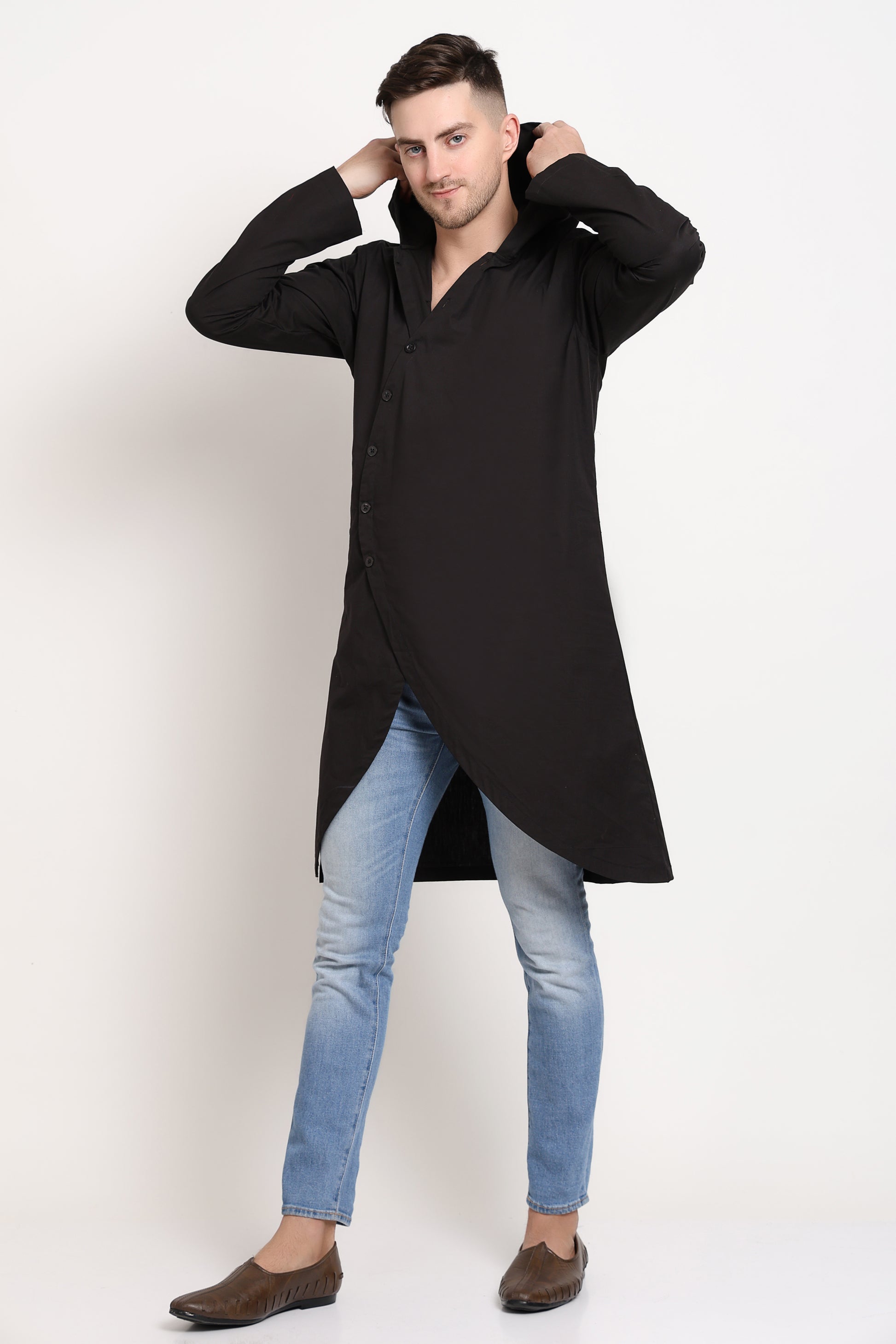 Asymmetric Black Hooded Kurta With Diagonal Button