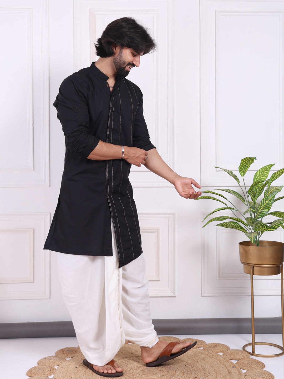 black cotton kurta featuring eye-catching golden thread detailing, made from cotton poplin, it provides comfort and durability for everyday wear or special occasions. The intricate golden embroidery enhances its elegance, making this kurta a versatile and stylish addition to any wardrobe. Perfect for cultural events, festive celebrations, or casual outings.