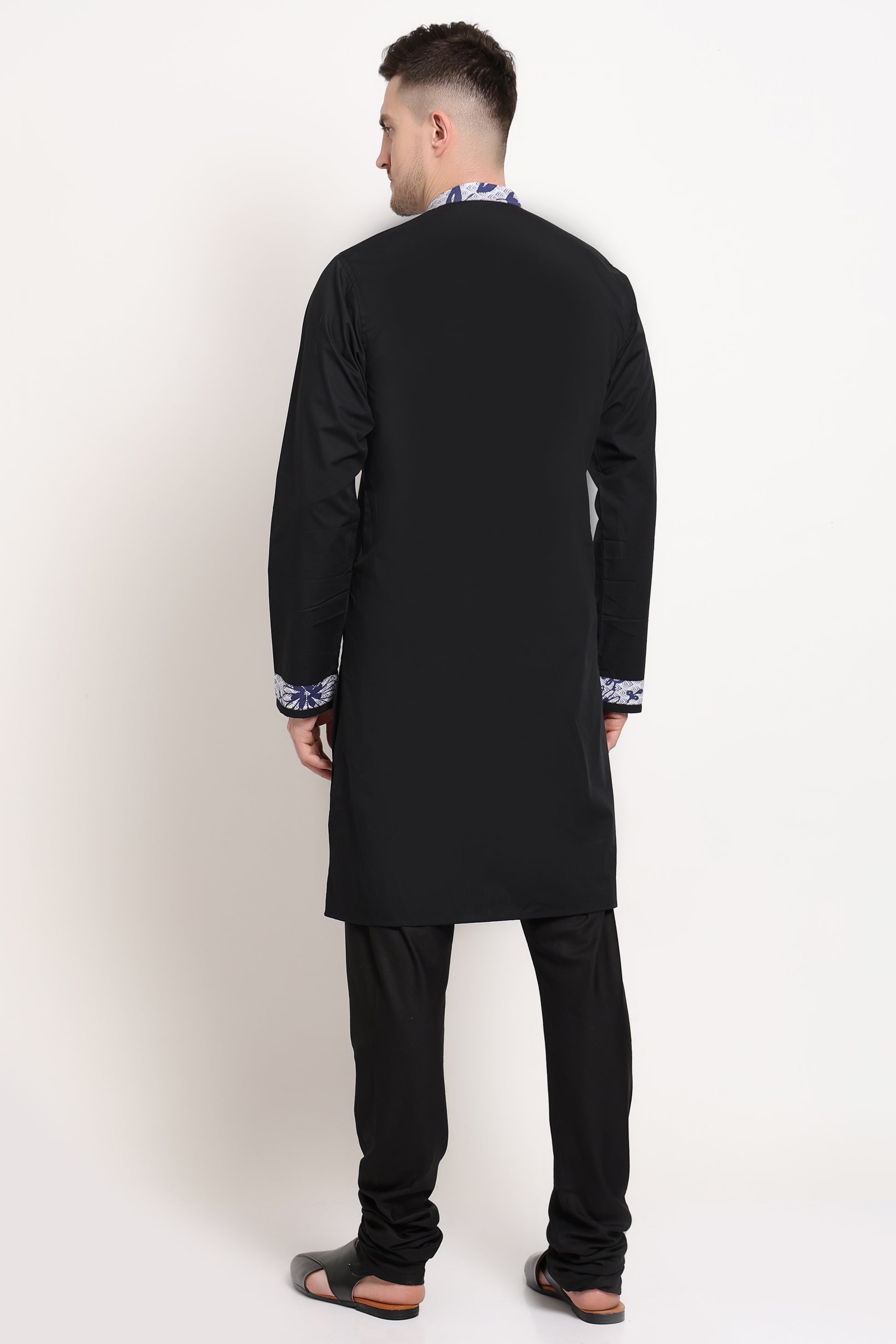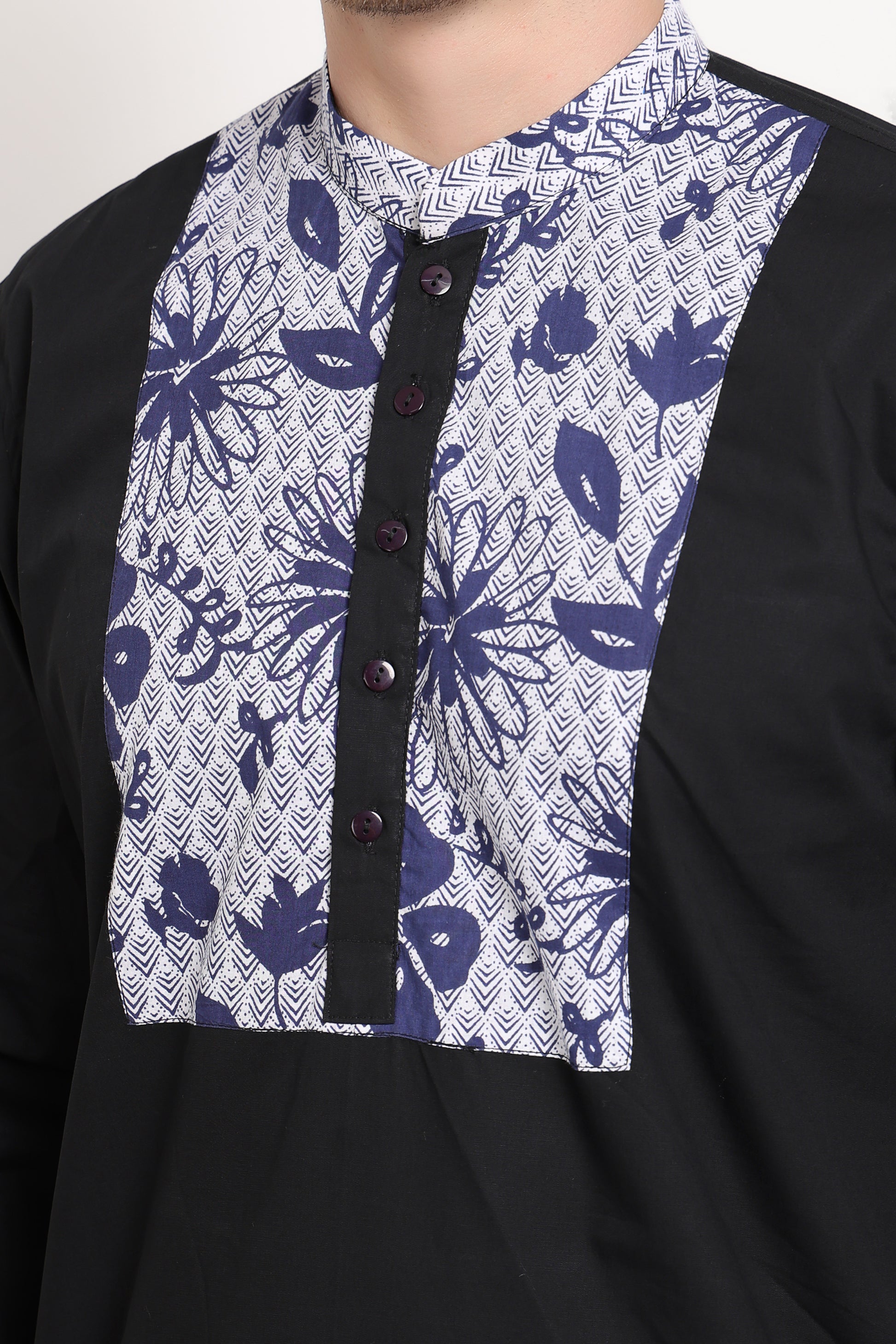 Step into timeless sophistication with this black kurta from Midav. Featuring a striking floral panel in shades of blue, white, and grey across the chest and cuffs, this ensemble blends tradition with modern flair. Crafted for festive occasions, cultural events, or premium gatherings, it offers comfort without compromising style.