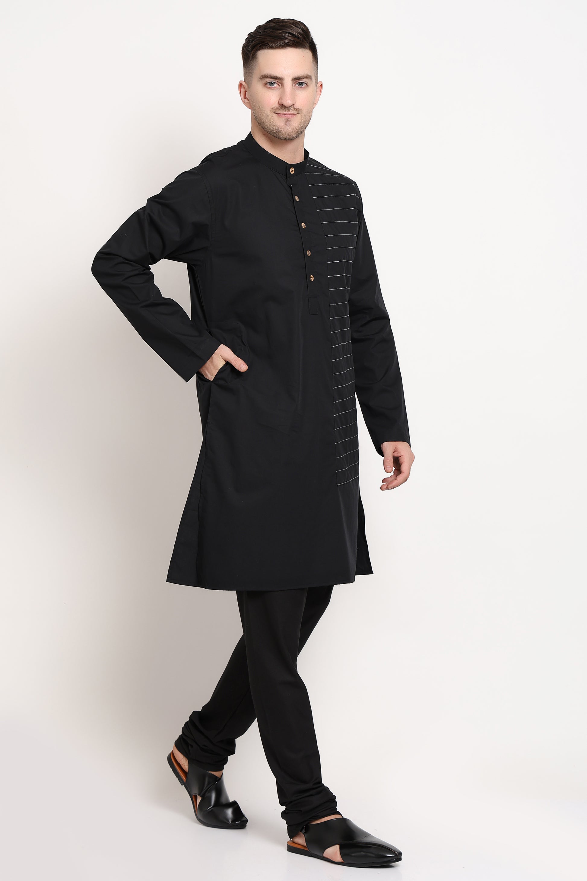 Linear Crest Kurta – Black with Horizontal Stripe Accent